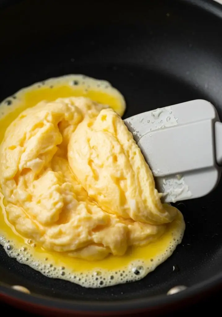 - Gentle Folds are Key. Let the eggs sit for about 20-30 seconds, until the edges just begin to set. Then, using a silicone spatula, gently push the set eggs from the edges of the pan towards the center, creating large, soft, silky curds. Continue this gentle pushing and folding motion for 1-2 minutes.