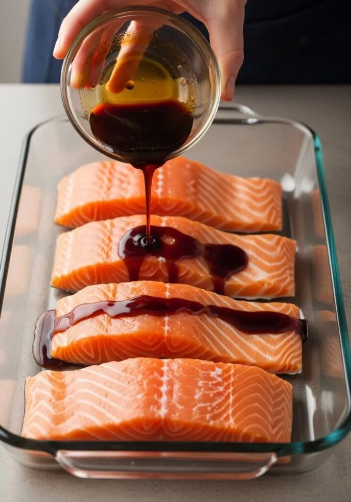 - Pour the glaze mixture evenly over the salmon fillets.