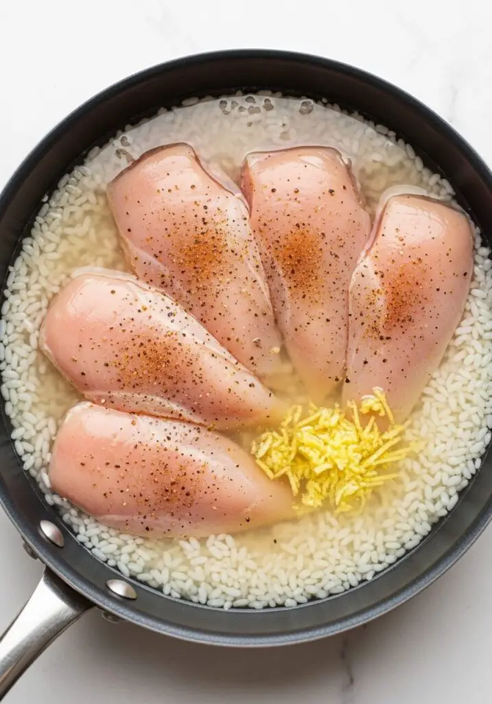 - In a medium saucepan, combine the rinsed rice, chicken broth, and 1 tablespoon of the grated ginger. Season chicken all over with salt and pepper and place it on top of the rice mixture.