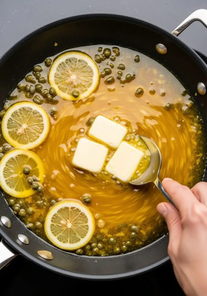 - Deglaze and Reduce. Pour in the chicken broth and use a wooden spoon or spatula to scrape up all the flavorful browned bits from the bottom of the pan. Add the thin lemon slices (if using) and bring the mixture to a boil. Let it boil, stirring occasionally, for 5-8 minutes, until the sauce has reduced by about one-third.