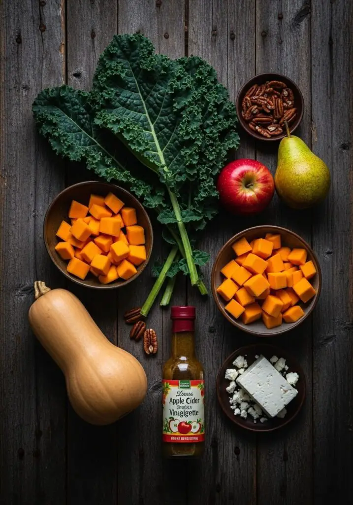 - Combine the Salad Base: In a large salad bowl, combine the kale, mixed greens, sliced apples, sliced pear, crumbled feta, and pecans.