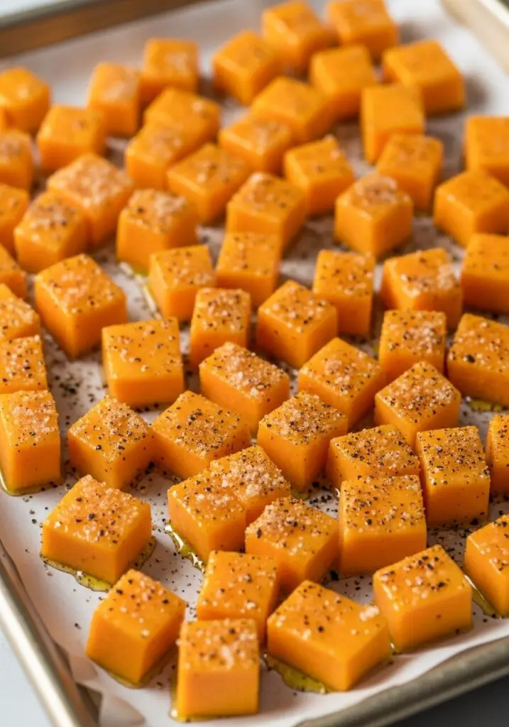 - Preheat oven to 400°F (200°C). On a baking sheet, toss the cubed butternut squash with olive oil, brown sugar, salt, and black pepper.