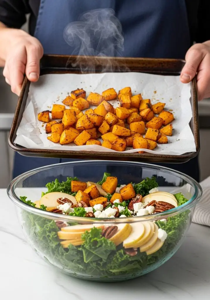 - The Final Touch: Add the warm, roasted butternut squash right to the bowl. Drizzle with your favorite apple cider vinaigrette, give it all a gentle toss, and serve immediately!
