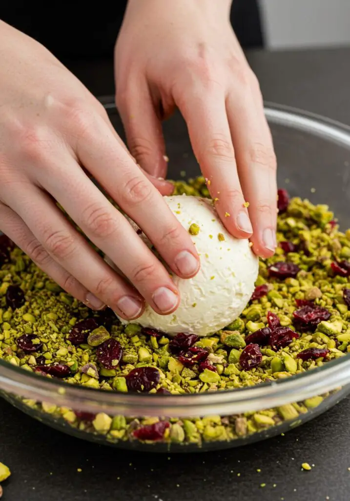 - Scoop the chilled cheese mixture into small balls, then roll each ball in the cranberry-pistachio mixture to coat completely.