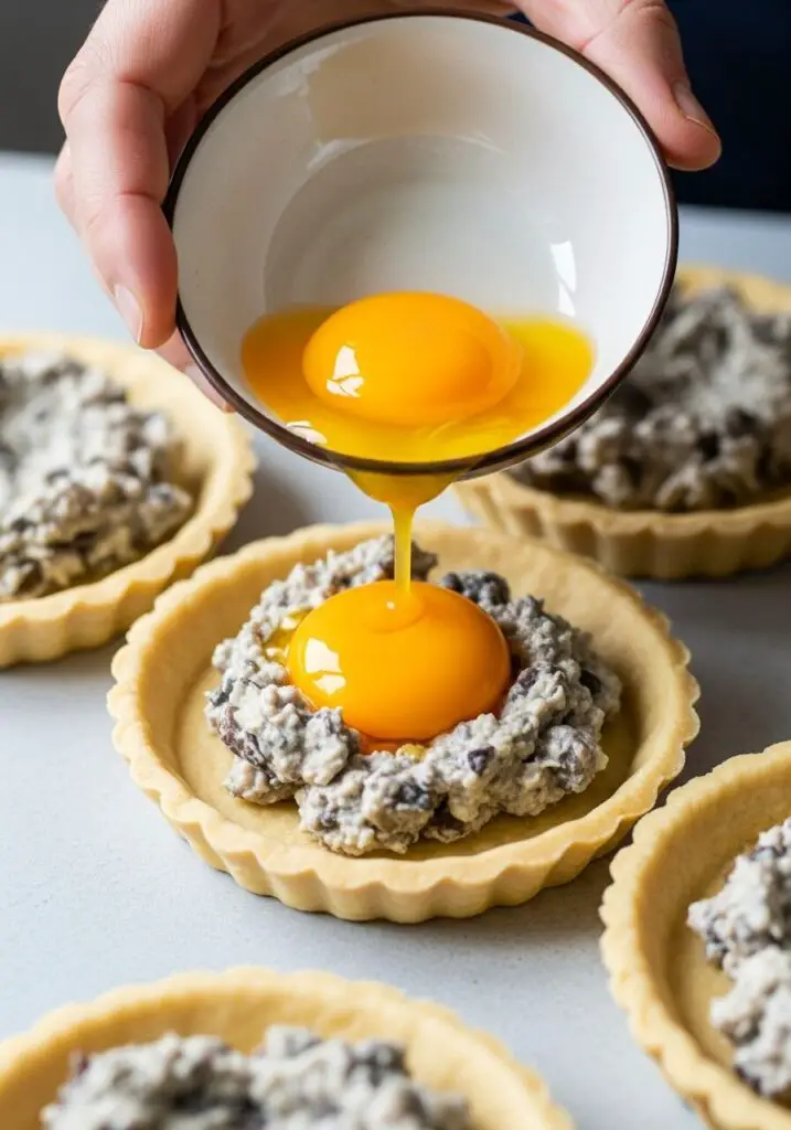 - Spoon the mushroom mixture into the cooled pastry shells, creating a small dent in the center. Carefully place one egg yolk into the center of each tart.