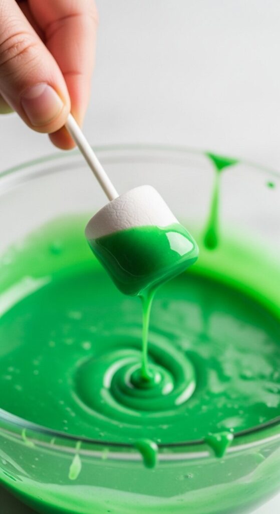 - Dip the Marshmallows: Push a lollipop stick firmly into the bottom of each marshmallow. Dip each marshmallow into the melted green candy, turning it to ensure it’s completely coated.