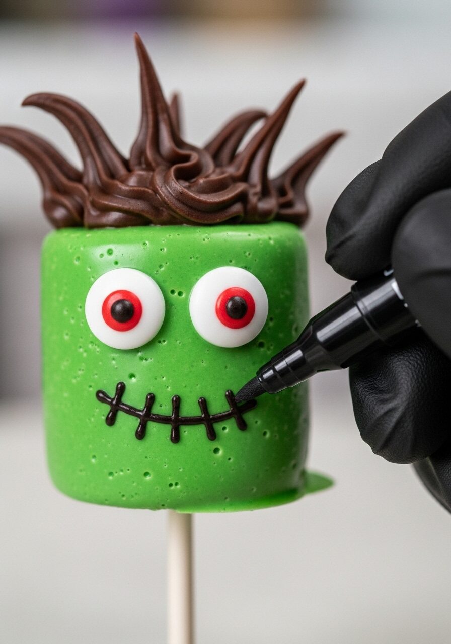 - Draw the Faces: Using the black edible marker, draw a quirky, stitched mouth onto each Frankenstein.