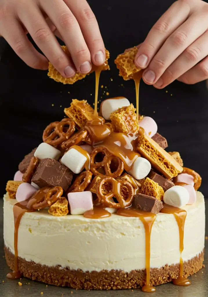 - The Grand Finale: Just before you’re ready to serve, carefully release the cheesecake from the springform tin and place it on a serving plate. Now, go wild! Pile the top high with your assorted marshmallows, chocolate-covered pretzels, fudge pieces, and honeycomb candy. Finally, drizzle generously with the salted caramel and the warm chocolate sauces, letting them drip beautifully down the sides.