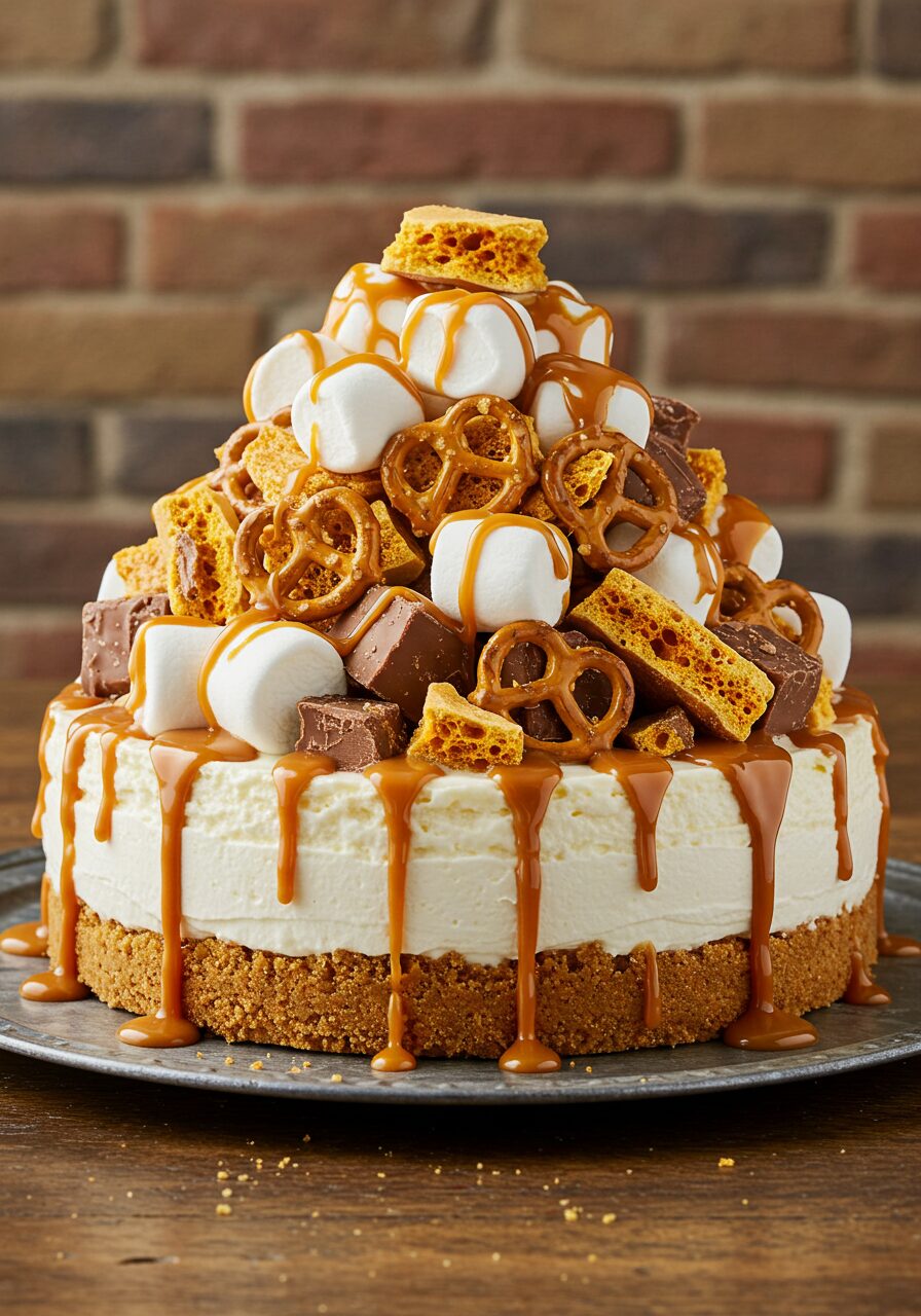 This isn’t just a cheesecake; it’s a celebration of all things delicious. We start with a classic, buttery biscuit crust, then top it with a light, fluffy, and cloud-like marshmallow and cream cheese filling. But the real magic happens on top. We create a glorious, chaotic, and absolutely irresistible mountain of toppings—soft marshmallows, chocolate-covered pretzels, crunchy honeycomb, and chewy fudge, all drizzled with cascades of rich chocolate and salted caramel sauce. It’s a true showstopper for any birthday, party, or celebration.