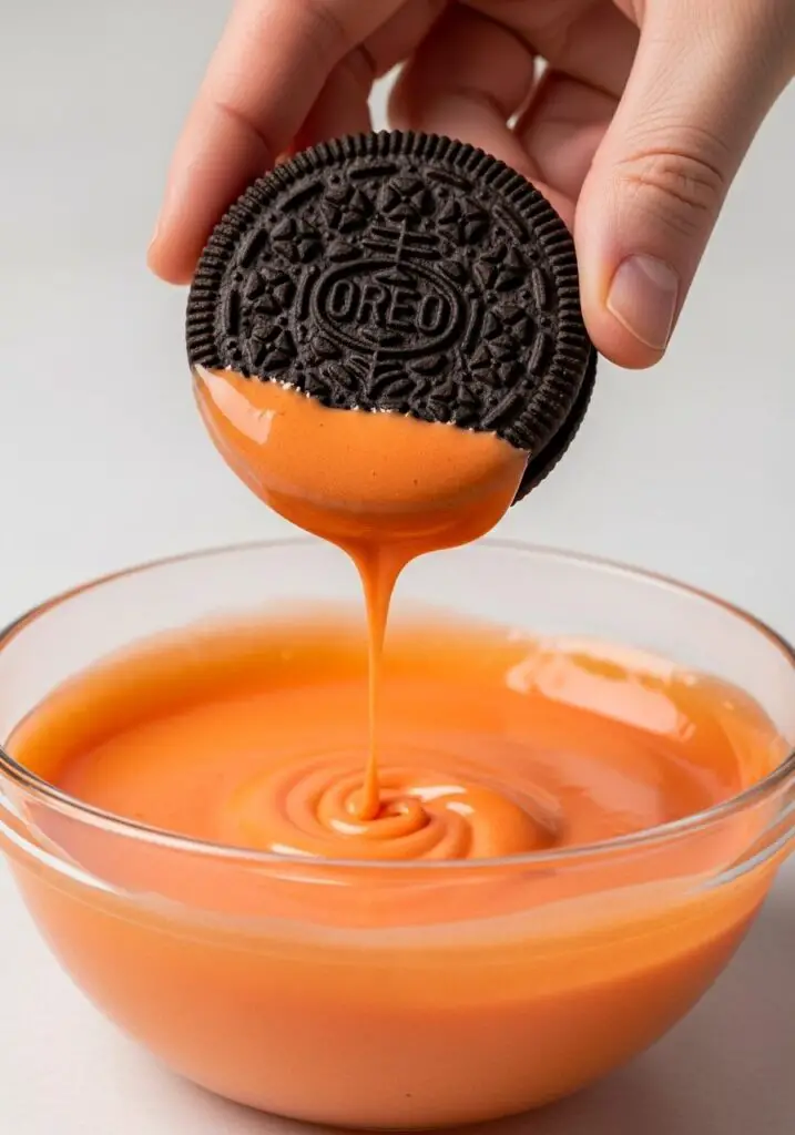 - Dip the Cookies: One at a time, dip the top of each Oreo cookie into the orange icing, letting any excess drip off back into the bowl. Place the iced cookie onto your prepared wire rack.