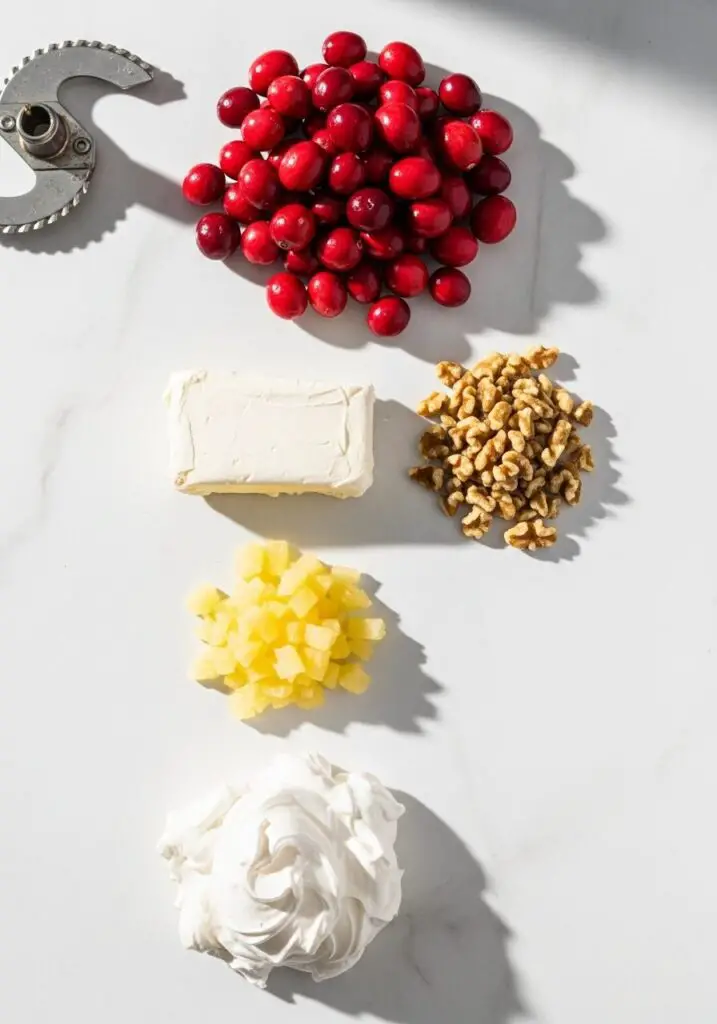 Here’s the thing about this recipe: it beautifully blurs the lines between a side dish and a dessert. It’s a creamy, frozen delight made with finely chopped fresh cranberries, tangy cream cheese, sweet crushed pineapple, and crunchy walnuts, all lightened with fluffy whipped topping. It’s a tradition that I cherish, a recipe passed down that always brings back the fondest memories of holidays past.