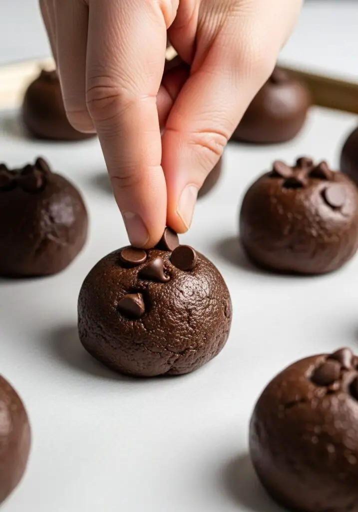 - Scoop the Dough: Using a cookie scoop or a spoon, portion the dough into heaping 1.5-tablespoon-sized balls. Place them on the prepared baking sheet, leaving space for them to spread. For that bakery-style look, press a few extra chocolate chips onto the top of each dough ball.