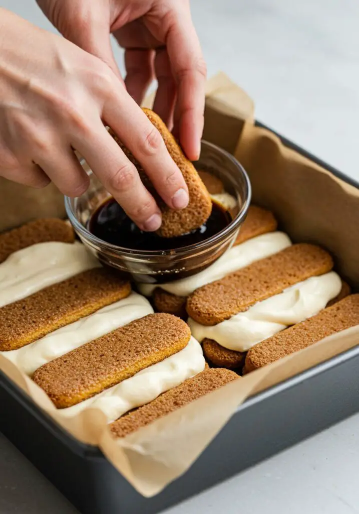 - First Layer of Sponge Fingers: Briefly dip about 100g of sponge fingers into the cooled coffee mixture. Don’t let them soak too long, just a quick dip on each side so they absorb the liquid evenly. Arrange these soaked sponge fingers in a single layer at the bottom of your prepared tin.