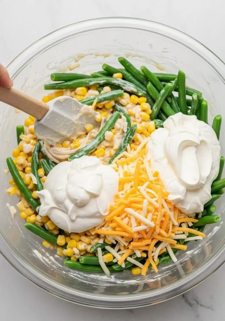 - Combine Everything: In a large mixing bowl, add the drained French style green beans, drained shoepeg corn, cream of celery soup, sour cream, shredded cheddar cheese, and your signature seasoning.