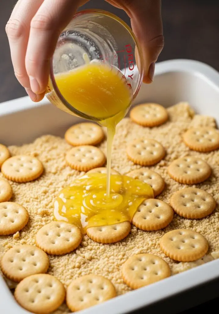 - Add the Butter: Drizzle the melted butter all over the cracker crumbs as evenly as possible.