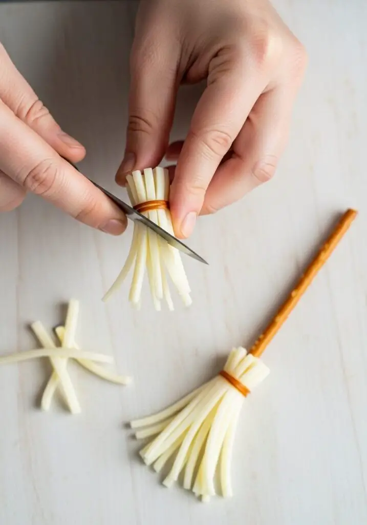 - Create the String Cheese Broomsticks: Cut each string cheese stick into thirds. About halfway up one of the small pieces, make several vertical cuts to create the “bristles” of the broom. Gently fan them out. Carefully insert a pretzel stick into the uncut end of the cheese.