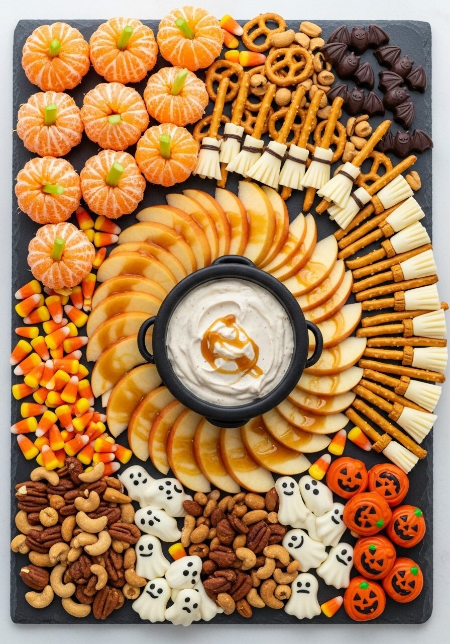 - To assemble the board, place the bowl of fruit dip in the center of a large platter. Arrange the sliced apples in a fanned-out circle around the bowl. Drizzle the apples with caramel sauce and top with Halloween-themed sprinkles.