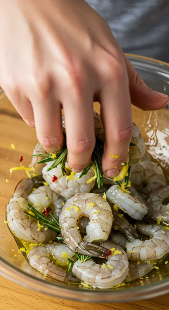 - Marinate the Shrimp: If you’re using wooden skewers, be sure to soak them in warm water for at least 15 minutes to prevent them from burning on the grill. Pat your shrimp completely dry and place them in a large bowl. Add the chopped rosemary, red pepper flakes, half of the minced garlic, 1/4 cup of the olive oil, the zest of one lemon, and 1 teaspoon of salt. Toss everything to coat and let the shrimp marinate for 15 minutes.