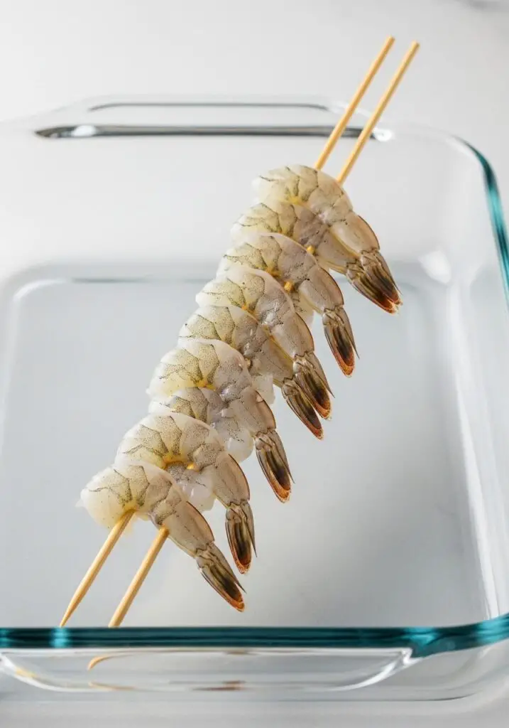 - Skewer Snugly: This is a key trick! Thread the shrimp onto sets of two parallel skewers. This stops them from spinning around. Alternate them head-to-tail and push them together so they are nestled snugly. Place the skewers across a baking dish so the shrimp are suspended in the air.