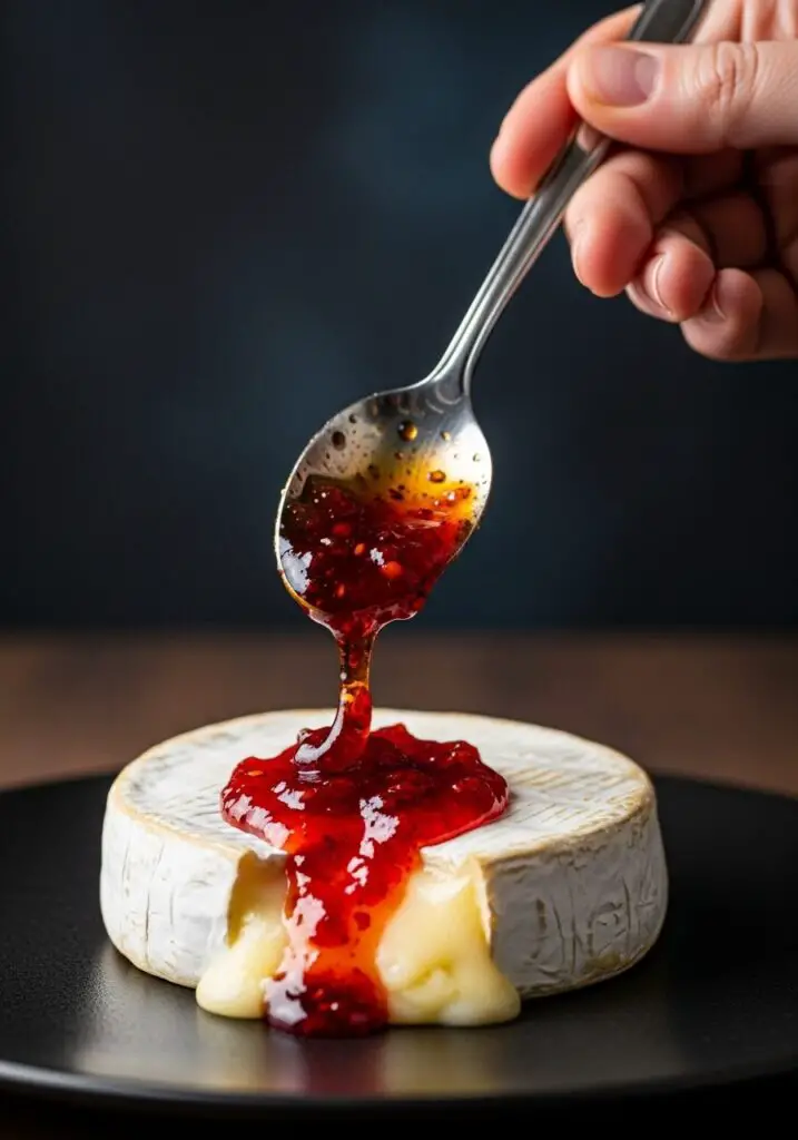 - Make the “Blood”: While the Brie is baking, prepare your gory topping. In a small bowl, combine the red pepper jam with 2 tablespoons of hot water. Whisk it together until it’s smooth and has a slightly runny, blood-like consistency. If it’s still too thick, add another tablespoon of hot water.