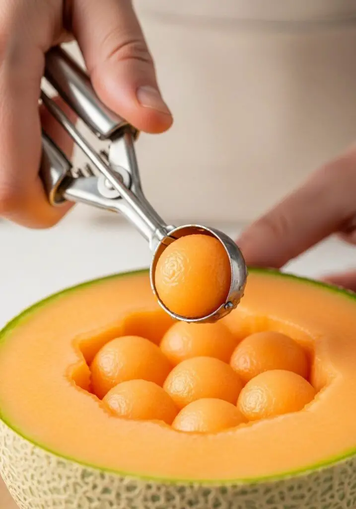 - Scoop the Cantaloupe: Use a melon baller to scoop perfect little spheres out of the cantaloupe half. These will be your “pumpkins.”