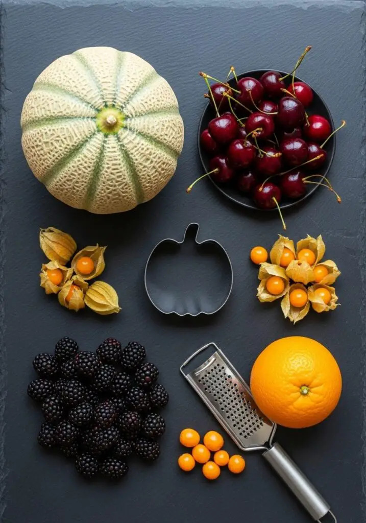 - Combine the Fruits: In a large, beautiful serving bowl, combine the cantaloupe pumpkins, the washed blackberries, the drained mandarin oranges, the pitted dark cherries, the halved golden berries, and the sliced apricots.