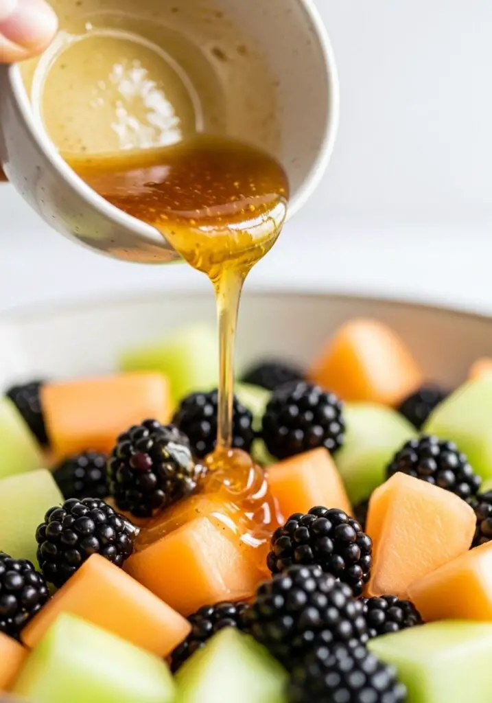 - Dress and Serve: Drizzle the honey-orange dressing over the fruit in the large bowl. Use a large spoon to stir very gently, just until all the fruit is lightly coated. Be careful not to mash the blackberries or break up the cantaloupe shapes. Serve immediately and enjoy!