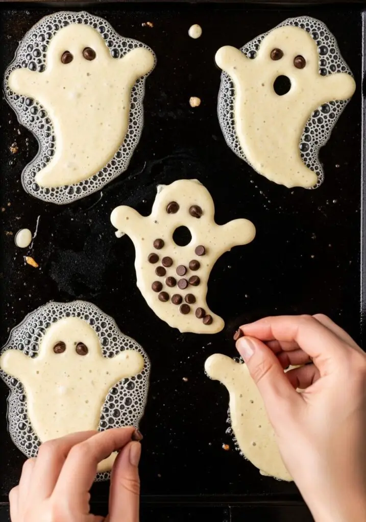 - Make the Faces: While the batter is still wet, quickly and gently place three chocolate chips on each ghost to make two eyes and a mouth.