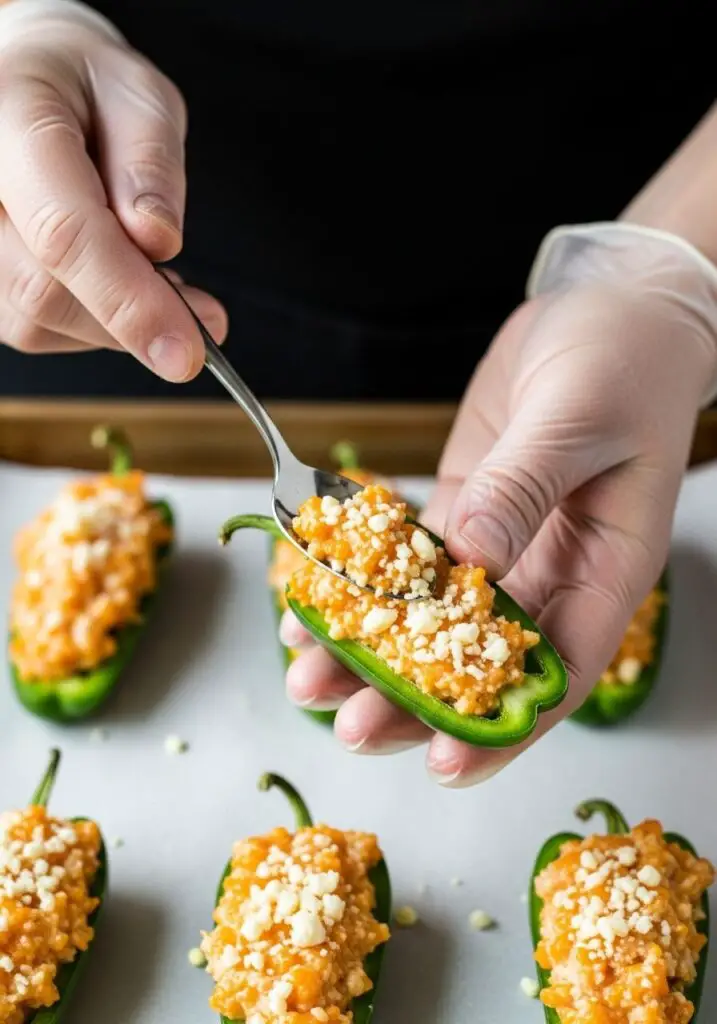 - Fill ‘Em Up: Spoon the cheesy filling into each jalapeno half, mounding it slightly.