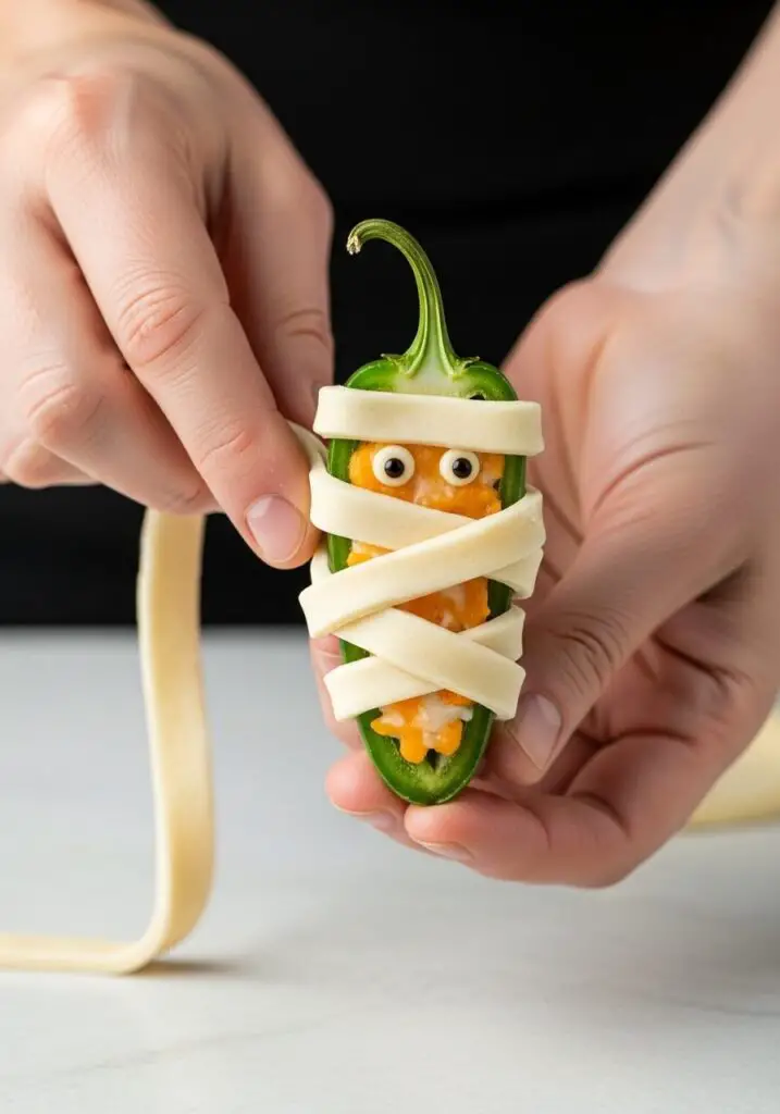 - Wrap Your Mummies: Take 2 or 3 strips of dough and wrap them around each filled pepper half in a crisscross pattern to look like mummy bandages. Make sure to leave a little open space near the top for the eyes to peek out. Place the wrapped poppers on your prepared baking sheet.