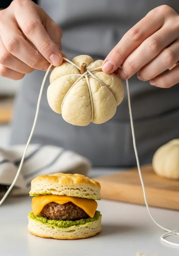 Letting the biscuits cool for 5 minutes allows the crust to set and become firm. If you try to remove the string when they are piping hot and super soft, the string can tear the delicate biscuit, ruining the perfect pumpkin shape you worked to create.