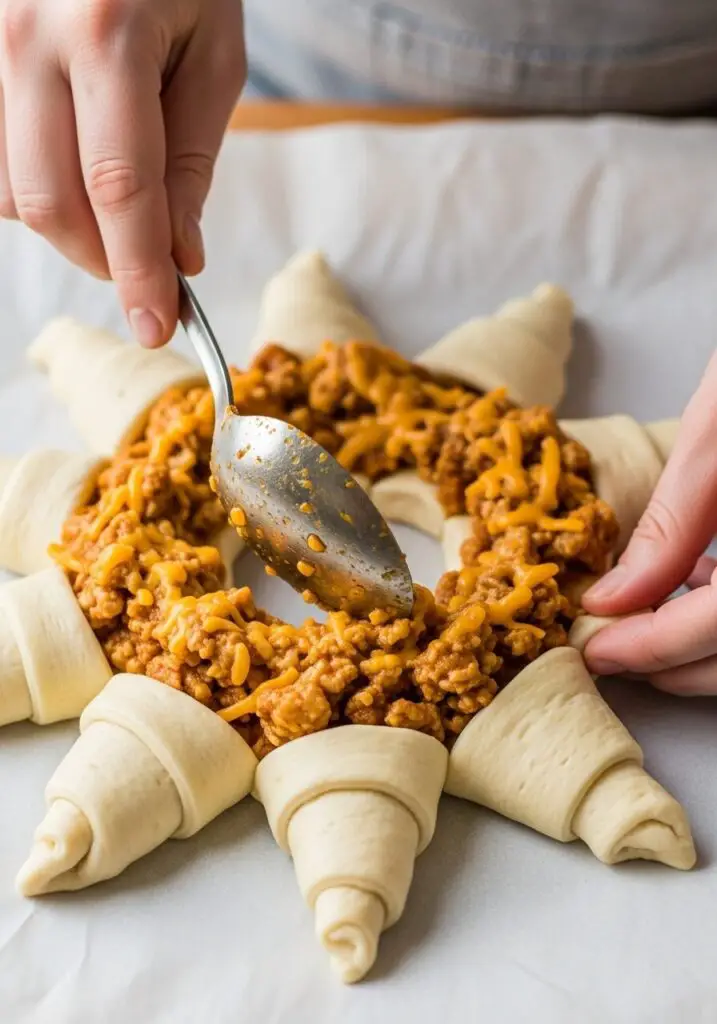 - Fill the Ring. Spoon the cooled taco mixture evenly over the overlapping ring of dough at the center.