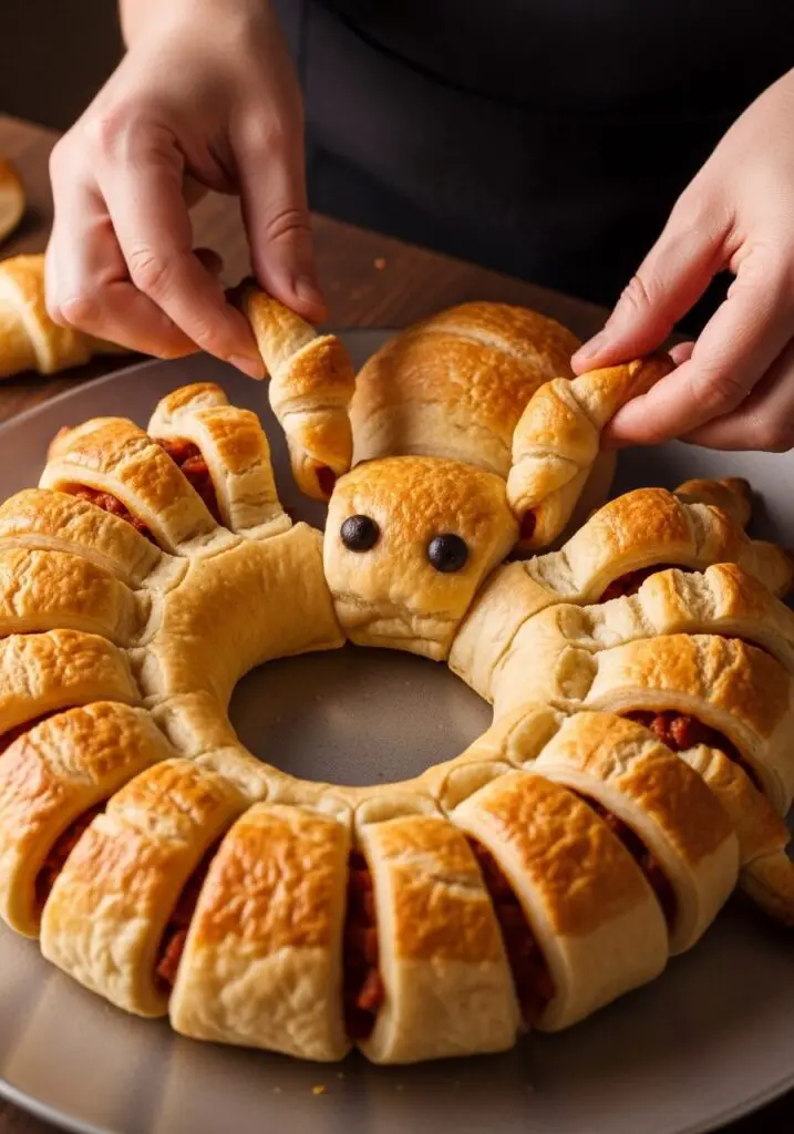 - Assemble the Spider. Let the body and legs cool for a few minutes so they’re easier to handle. Carefully transfer the spider body ring to a large serving platter. Gently insert four of the baked crescent roll “legs” into each side of the body, tucking them between the folded strips so they stand up.