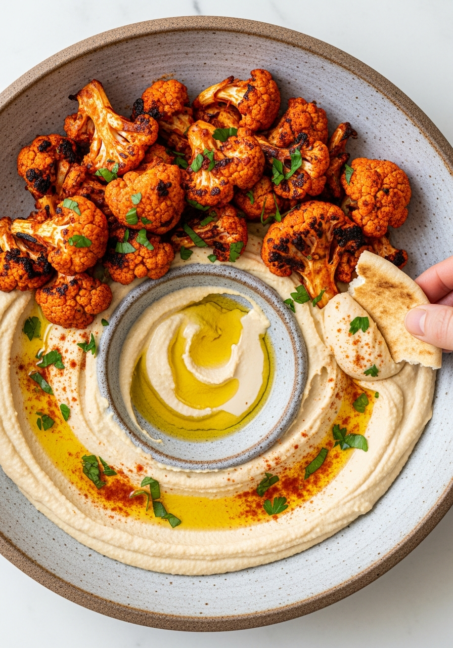 - Crown with Cauliflower: Pile the hot, roasted harissa cauliflower on top of the hummus. Garnish with a final sprinkle of chopped parsley and serve immediately with warm pita or crusty bread.