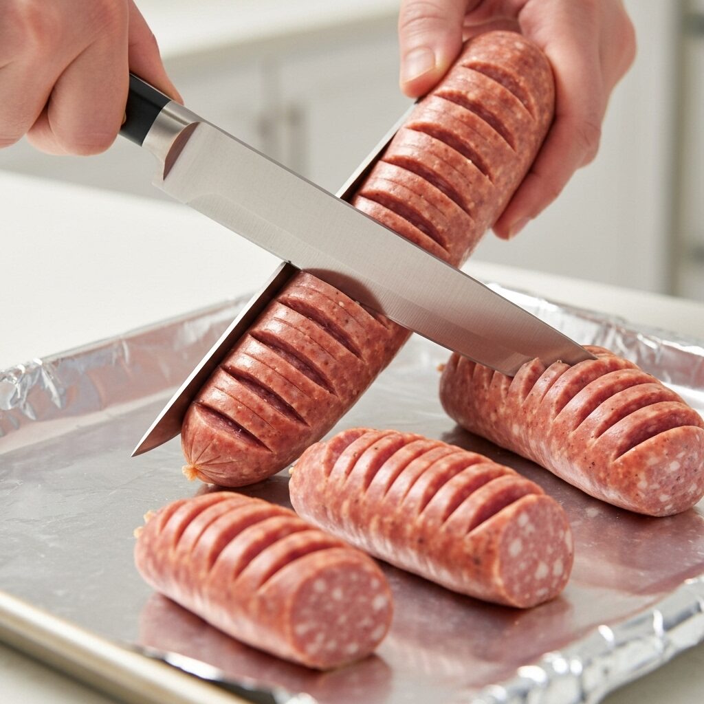 - Slice Sausage (Hasselback Style!): Take your 1 lb. hickory-smoked sausage. Carefully slice it crosswise at ¼-inch intervals, cutting to within ¼ inch of the bottom of the sausage – do not cut all the way through! This creates the hasselback effect.