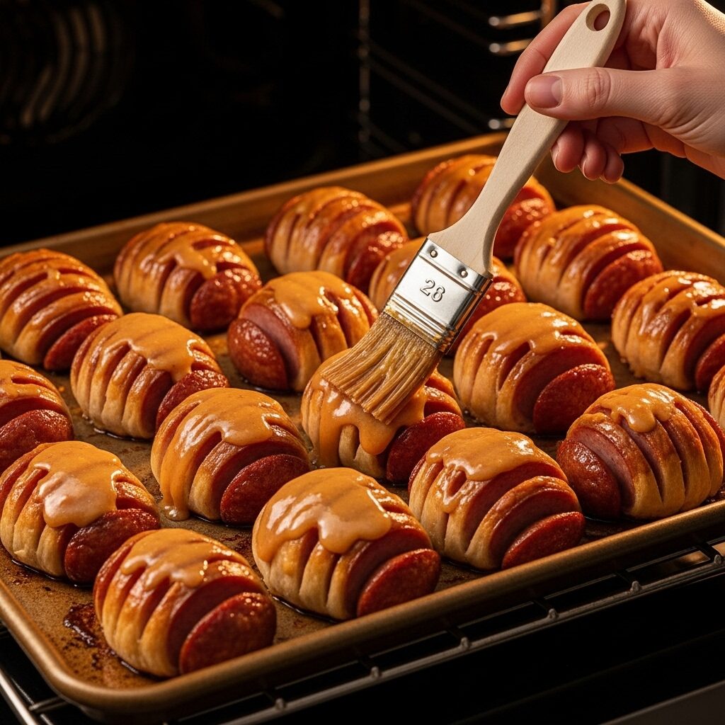 - Final Glaze for Sausage: Once the sausage bites are baked, remove them from the oven. Brush the remaining peach-mustard glaze mixture over the hot sausage bites.