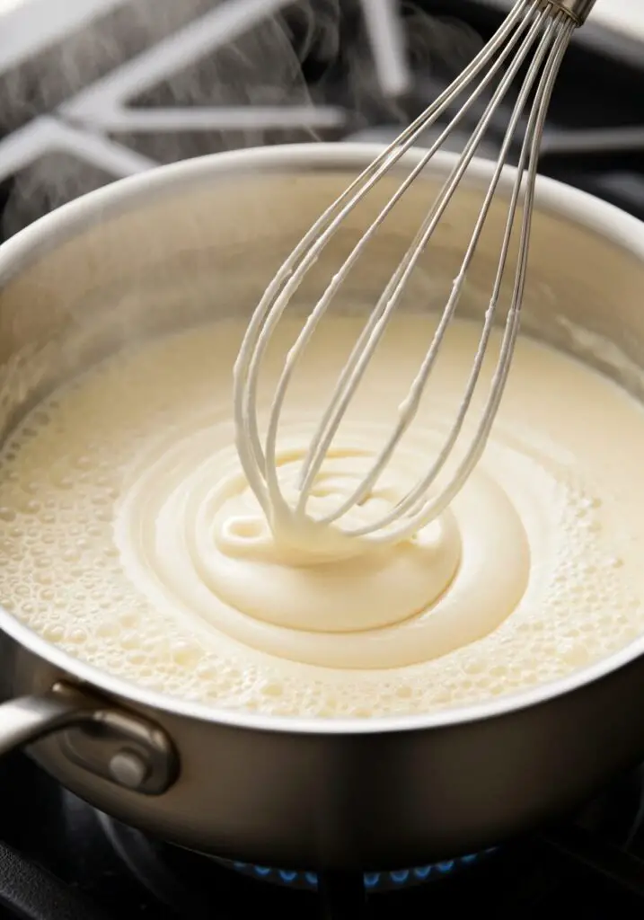 - Create the Sauce: Gradually pour in the evaporated milk while whisking continuously to prevent lumps. Continue cooking and stirring for 4 to 5 minutes, until the mixture comes to a boil and has thickened into a smooth, creamy sauce. Season well with salt and pepper, then pour this sauce into the bottom of your prepared dish.