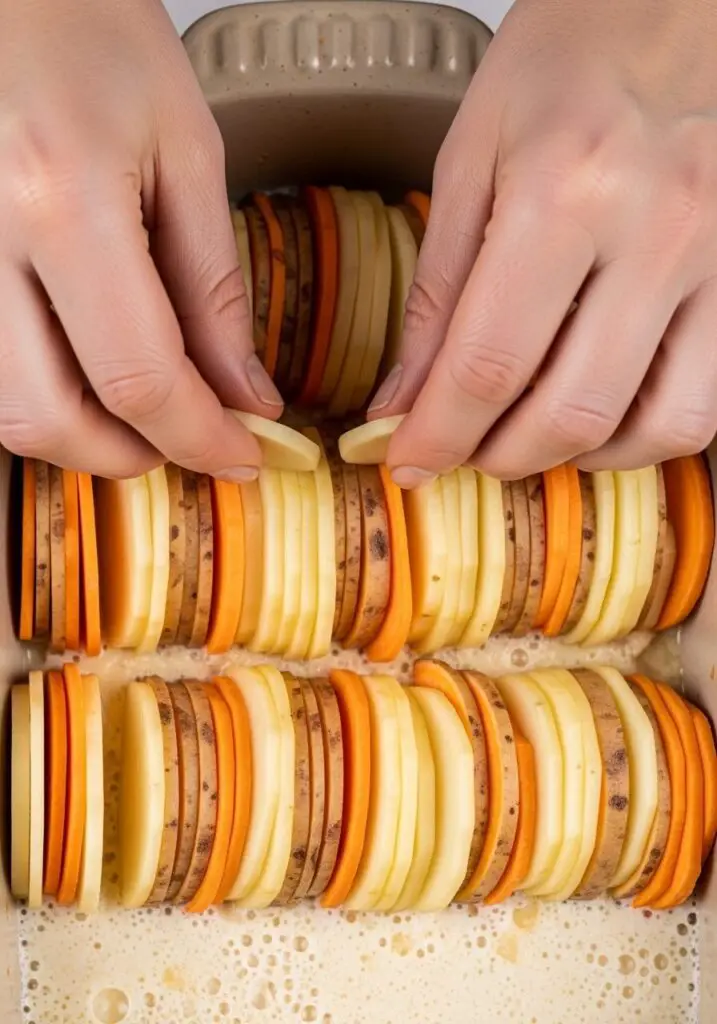 - Arrange the Slices: Now for the fun part! Begin arranging the potato and sweet potato slices vertically (standing upright) in the sauce in your prepared dish. Alternate between a few slices of potato and a few slices of sweet potato to create a beautiful striped pattern.