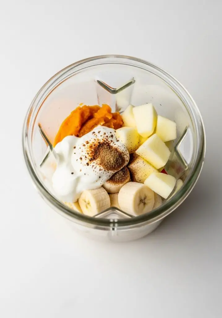- Dump, Blend, and Enjoy!: This is the best part. Add all of your ingredients—the pumpkin puree, frozen banana, apple chunks, Greek yogurt, almond milk, maple syrup, vanilla, and spices—to your blender.