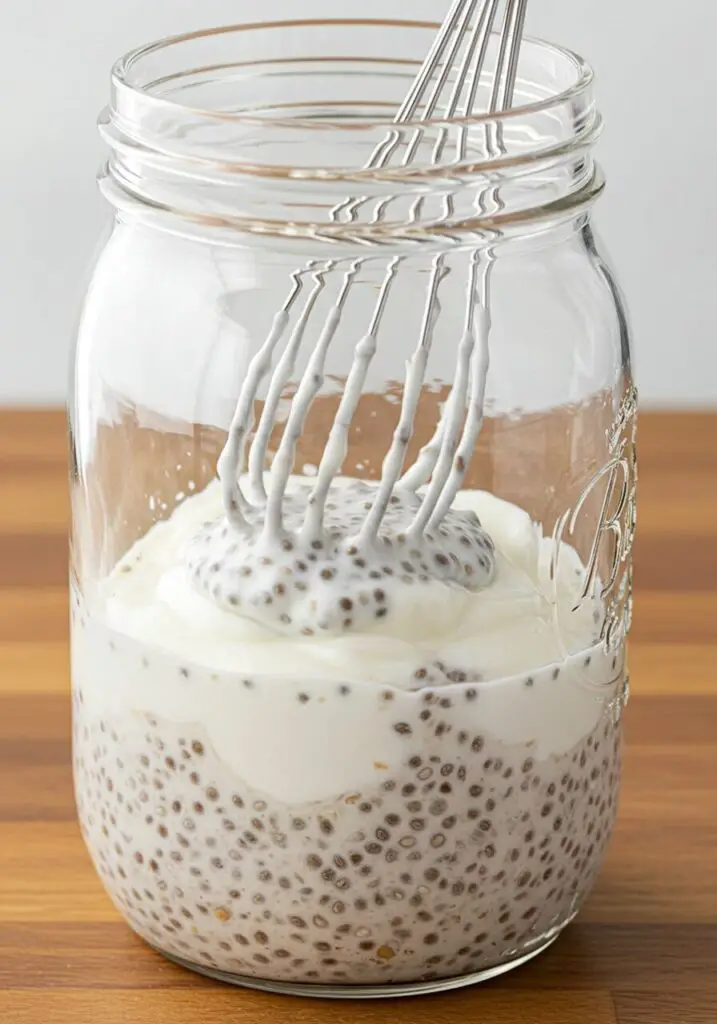 - Mix the Pudding Base: In a large mason jar or a container with a lid, add the chia seeds, almond milk, Greek yogurt, and your chosen sweetener.