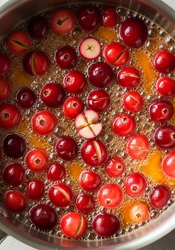 - Listen for the Pop!: Let the mixture simmer uncovered for 10 to 12 minutes, stirring occasionally. You will begin to hear satisfying little “popping” noises as the cranberries burst open from the heat.