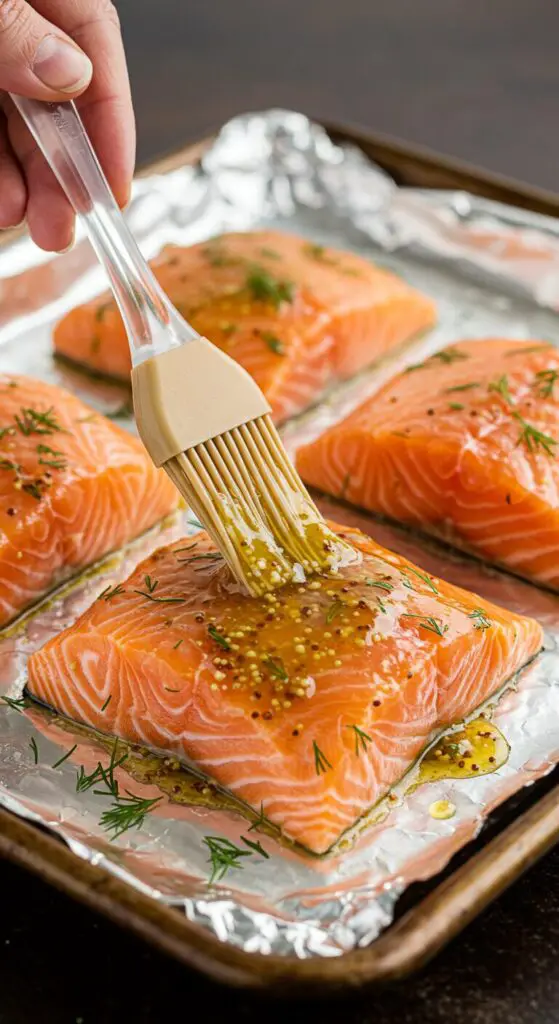 - Use a basting brush to coat the top and sides of the salmon fillets with the honey mustard glaze.