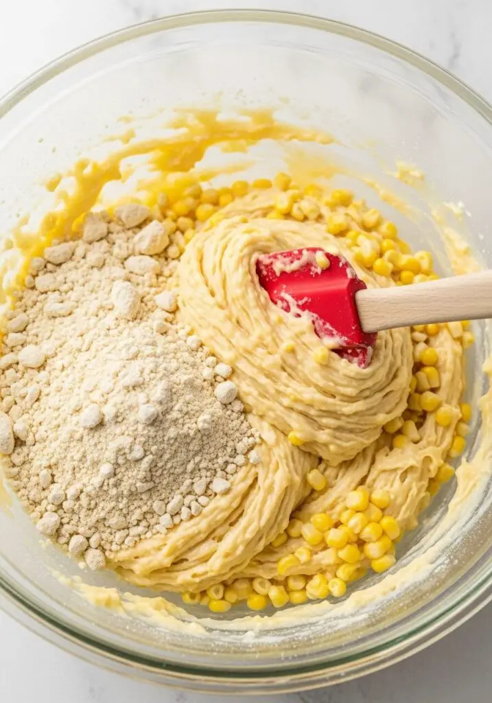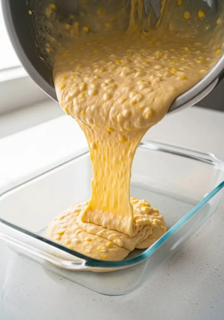 - Pour the corn mixture into the prepared pan and spread evenly.