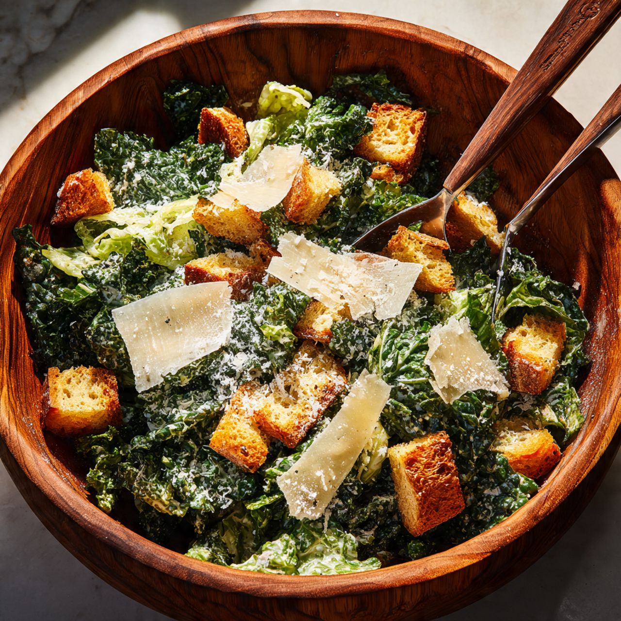 - Garnish and Serve: Transfer the dressed greens to a serving bowl or platter. Top generously with the homemade croutons and shavings of Parmesan cheese. If desired, add roasted chickpeas or diced avocado. Serve immediately, with extra dressing on the side.