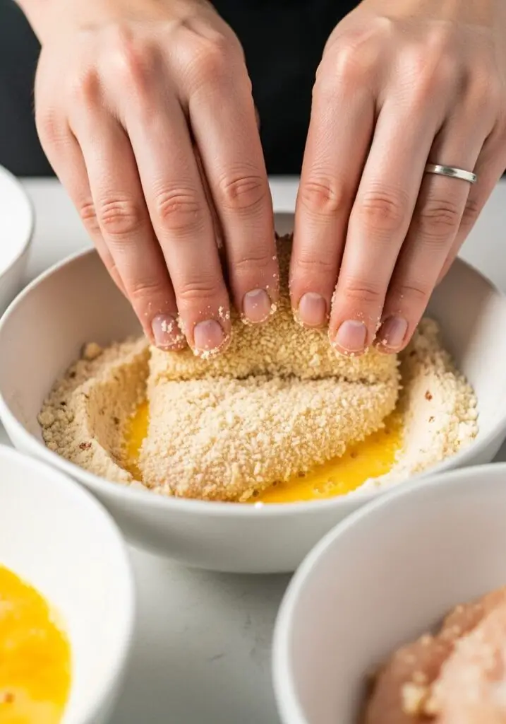 Why it matters: Pounding the chicken not only tenderizes it but also ensures it cooks quickly and evenly, preventing dry spots. - Initial Flour Coat. Sprinkle the pounded chicken breasts with salt, then lightly coat both sides with almond flour, shaking off any excess. Set aside the remaining almond flour for the final breading step.