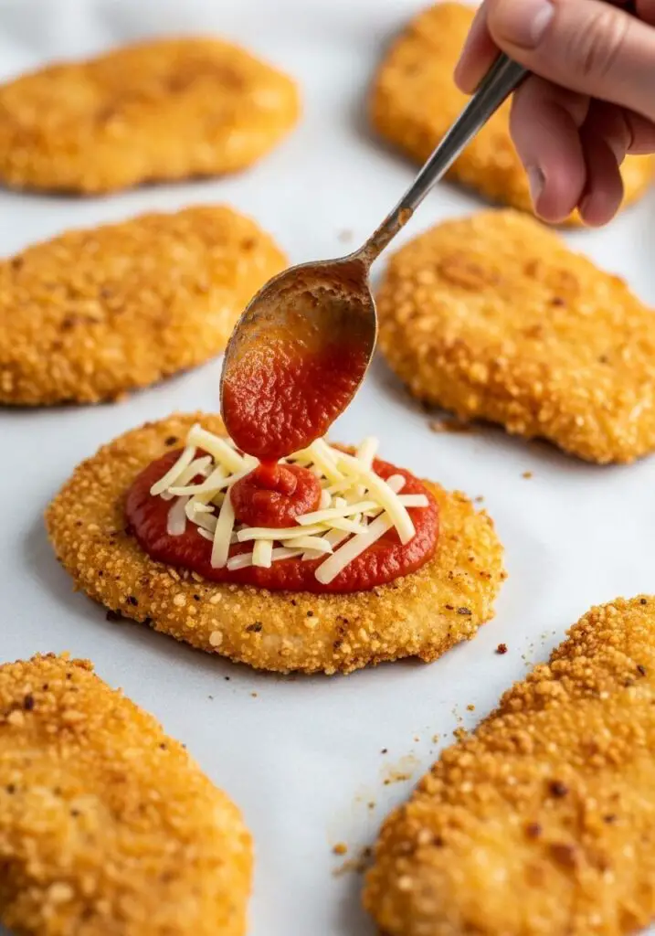 An air fryer is a fantastic option! Place the breaded chicken in the air fryer basket in a single layer (you may need to work in batches). Cook at 400°F (200°C) for about 10 minutes, flipping halfway through. Once cooked, you can add the toppings and air fry for another 1-2 minutes to melt the cheese.