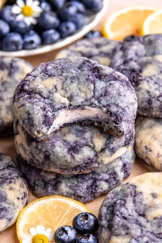 - Preheat your oven to 350°F (175°C) and line a baking sheet with parchment paper., 2. In a large bowl, cream together the butter, granulated sugar, and brown sugar until smooth., 3. Beat in the eggs one at a time and stir in the vanilla., 4. In another bowl, whisk together the flour, baking soda, and salt. Gradually add to the butter mixture., 5. Stir in the lemon juice, lemon zest, and blueberries until evenly distributed., 6. In a separate bowl, mix the softened cream cheese and powdered sugar until smooth., 7. Drop a tablespoon of cookie dough on the prepared baking sheet, make a small well in the center, and fill with a teaspoon of the cream cheese mixture. Top with more cookie dough to cover the filling., 8. Bake for 10-12 minutes until edges are golden., 9. Let cool on the baking sheet for a few minutes before transferring to a wire rack to cool completely.