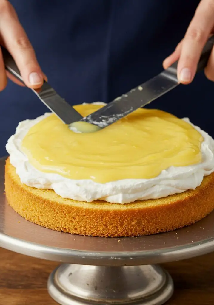- Assemble Your Masterpiece: Once the cake layers are completely cool, it’s time to assemble! Place your first cake layer on a serving platter or cake stand. Spread it with a generous layer of the lemon buttercream (about one-third of the total). Then, spoon and spread a layer of lemon curd over the buttercream.