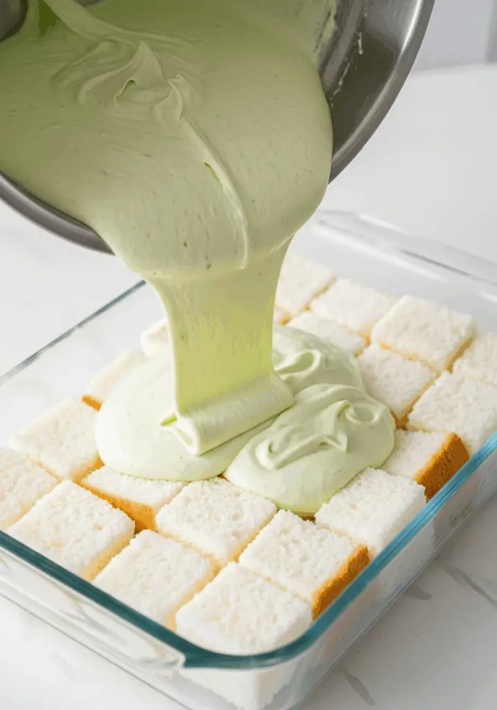 - Cover the Cake: Pour the finished lime mousse evenly over the top of the angel food cake cubes in the dish, using a spatula to spread it to the edges and cover the cake completely.