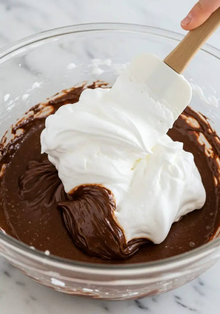 - Make the Chocolate Batter and Bake: In a separate large bowl, combine all the remaining cake ingredients—the egg yolks, cocoa, flour, sugar, bicarb, salt, oil, and vanilla—along with 190ml (about 3/4 cup) of water. Blend them together until you have a rich, thick chocolate mixture. Now for the crucial step: gently fold the stiffly beaten egg whites into the chocolate mixture. Do not beat or stir vigorously! You want to keep all that air in. Fold until there are no more white streaks, then pour the batter into your prepared tin.